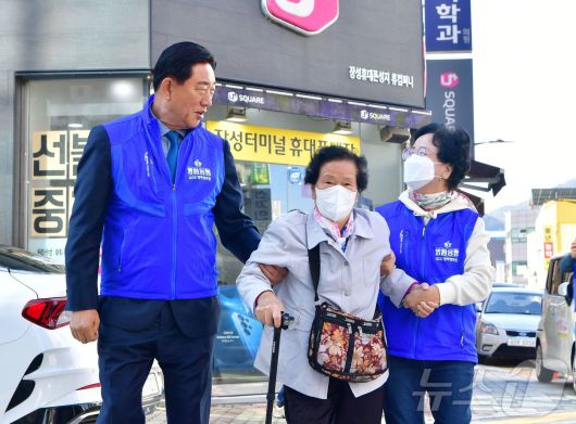 김한종 전남 장성군수(왼쪽)이 어르신을 병원까지 모시는 ‘병원 동행 서비스’를 직접 하고 있다.(장성군 제공. 재배포 및 DB 금지) |