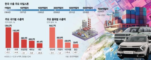 특히 수출 6000억 달러는 세계에서 일곱 번째로 달성했으나 7000억 달러는 여섯 번째로 달성하며 우리 수출이 글로벌 주요국 대비 빠르게 성장하고 있음을 증명했다.