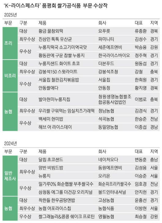 지난달 28일부터 30일까지 경기 고양시 일산 킨텍스에서 개최된 '제2회 우리쌀·우리술 K-라이스페스타' 품평회 쌀 가공식품 부문에서는 총 12점이 수상작으로 선정됐다. 지난해 개최된 제1회 K-라이스페스타에서는 일반 제조사와 농협 부문에서 총 8점이 수상했지만 이번에는 조리, 비조리, 농협 등 3개 부문에서 4점씩 수상작이 나왔다.
