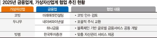 스테이블코인 등 시대 변화에 따른 '신 금융'이 등장하면서 금융업과 가상자산업계가 협업을 추진 중이다. 두나무도 네이버파이낸셜뿐만 아니라 지난 3일 하나금융그룹과 블록체인 기술 기반 글로벌 금융서비스 공동 개발을 위한 MOU를 체결했다. 빗썸도 지난 24일 한국투자증권과 MOU를 맺었다.