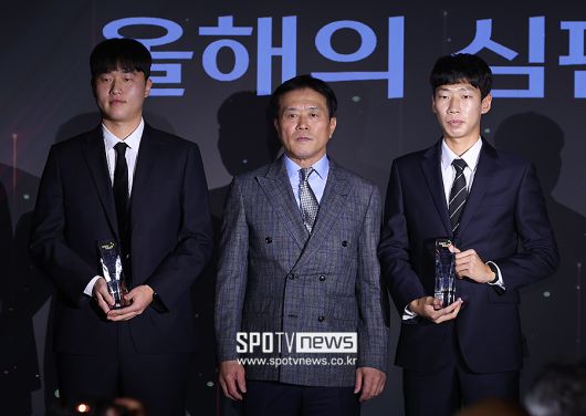 [스포티비뉴스=수원, 곽혜미 기자] 한국대학축구연맹이 29일 오후 경기도 수원시 영통구 아주대학교 율곡관에서 '2025 KUFC(한국대학축구연맹) AWARDS'를 진행했다. 심판상을 수상한 이윤섭, 김석훈 심판이 대한축구협회 문진희 위원장과 기념 촬영을 하고 있다. <저작권자 ⓒ SPOTV NEWS. 무단전재 및 재배포 금지>