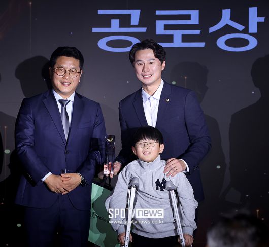 [스포티비뉴스=수원, 곽혜미 기자] 한국대학축구연맹이 29일 오후 경기도 수원시 영통구 아주대학교 율곡관에서 '2025 KUFC(한국대학축구연맹) AWARDS'를 진행했다. 공로상을 수상한 경기도의회 문화체육관광위원회 황대호 위원장이 한국대학축구연맹 박한동 회장과 기념 촬영을 하고 있다. <저작권자 ⓒ SPOTV NEWS. 무단전재 및 재배포 금지>