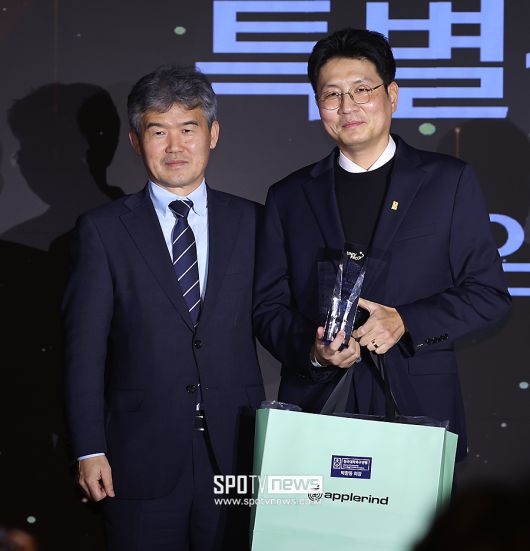 [스포티비뉴스=수원, 곽혜미 기자] 한국대학축구연맹이 29일 오후 경기도 수원시 영통구 아주대학교 율곡관에서 '2025 KUFC(한국대학축구연맹) AWARDS'를 진행했다. 연맹 임원 부문 특별상을 수상한 한국대학축구연맹 박준호 부회장이 대한축구협회 김승희 전무이사와 기념 촬영을 하고 있다. <저작권자 ⓒ SPOTV NEWS. 무단전재 및 재배포 금지>