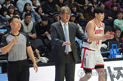 (고양=연합뉴스) 김병만 기자 = 29일 고양 소노아레나에서 열린 2025-2026 프로농구 고양 소노와 서울 SK 경기에서 소노 손창환 감독이 작전 지시하고 있다. 2025.12.29