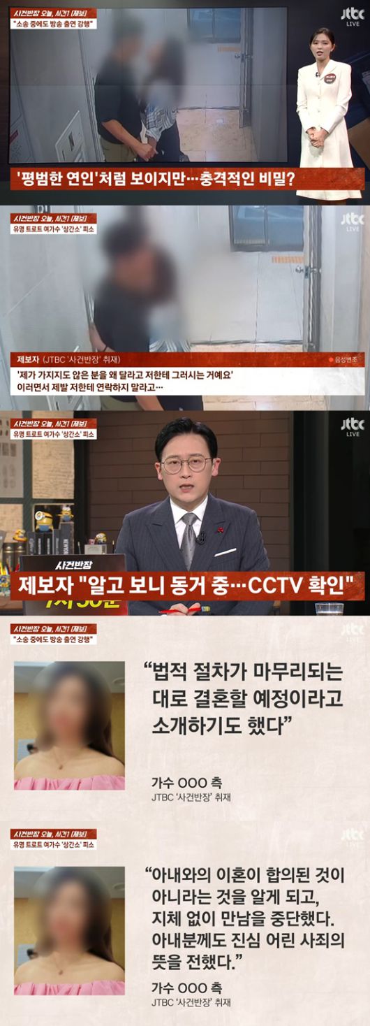제보자의 남편은 해당 여가수와 친구 사이라고 했지만, 제보자는 불륜 관계임을 의심하게 됐다고 전했다. 제보자는 “남편과는 친구 사이라고 했고, 계속 연락하면 소속사를 통해 고소하겠다고 하더라. 그런데 알고 보니 같이 살고 있었다”고 주장했다.