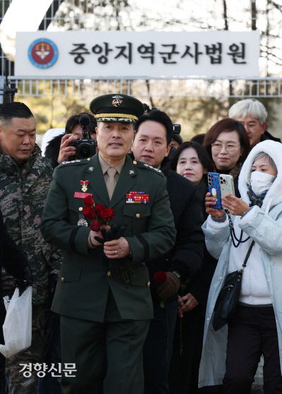 해병대 채모 상병 순직 사건 수사 관련 항명 및 상관명예훼손 혐의로 기소돼 1심에서 무죄를 선고받은 박정훈 전 해병대 수사단장(대령)이 1월9일 서울 용산구 중앙지역군사법원에서 걸어나오고 있다. 5개월 후, 진실을 좇던 수사단장은 마침내 무죄를 확정받았다. 박 대령은 초동수사기록의 이첩을 보류하라는 상부의 지시에 따르지 않고 경찰로 이첩한 혐의로 군 검찰에 의해 기소됐다. 한수빈 기자