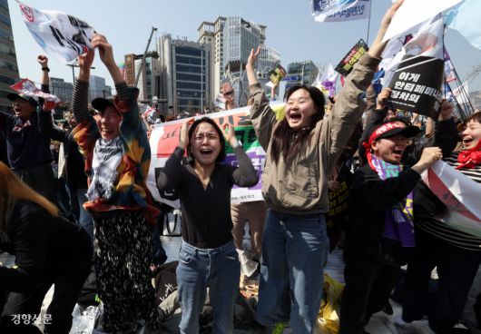 “윤석열을 파면한다” “주문, 피청구인 대통령 윤석열을 파면한다.” 문형배 헌법재판소장 권한대행이 결정문을 읽었다. 헌법재판소 재판관 전원일치 의견으로 윤석열 대통령을 파면한 4월4일 헌법재판소 인근에서 열린 대통령 파면 촉구 집회에 참석한 시민들이 일제히 자리에서 일어나 환호하고 있다. 올해 가장 긴장한 순간이면서 동시에 후련했던 순간이다. 서성일 선임기자 |
