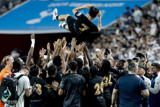 ‘캡틴’ 손흥민 토트넘 고별전 토트넘에서 등번호 7번을 달고 10년간 활약했던 손흥민의 고별전이 열린 8월3일 경기를 마친 팀 동료들이 헹가래를 쳐주고 있다. 선발 출전한 손흥민의 유니폼 등번호는 화려한 태극 문양으로 꾸며졌다. 이날 토트넘 선수단 전원도 이 유니폼을 입고 그라운드를 누볐다. 문재원 기자