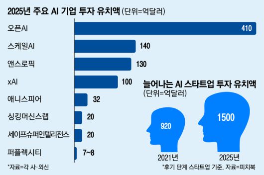 AI 검색 기업 퍼플렉시티도 올해 두 차례 투자 유치를 통해 8억달러를 조달했으며 기업 가치는 200억달러로 1년 새 두 배 이상 상승했다. 오픈AI 출신 인사들이 설립한 싱킹머신스랩과 세이프슈퍼인텔리전스 역시 수조 원대 투자를 유치하며 이 흐름에 합류했다.