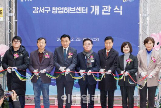 [이데일리 김태형 기자] 진교훈(가운데) 강서구청장이 29일 예비·초기 창업기업의 안정적인 성장을 돕는 ‘창업허브센터’ 개관식에서 관계자들과 테이프커팅을 하고 있다.