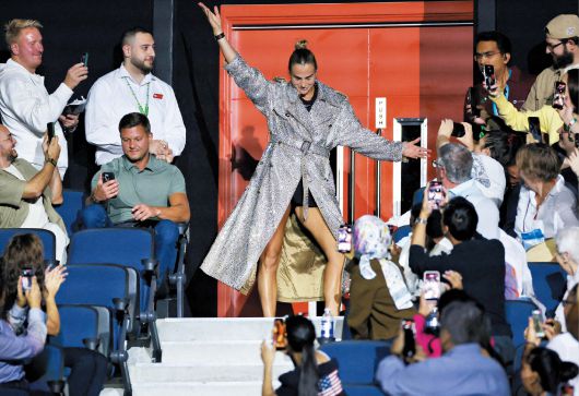 라켓은 안 들고… 춤추면서 입장하는 사발렌카 여자 테니스 세계 1위 아리나 사발렌카(가운데)가 29일(한국 시각) 남자 테니스 671위 닉 키리오스와의 배틀 오브 더 섹시스(성 대결) 경기에 앞서 은빛으로 반짝이는 코트를 입고 춤을 추며 경기장에 입장하고 있다. 사발렌카는 경기 전 “무조건 이길 것”이라고 했지만 키리오스에게 0대2로 졌다./로이터 연합뉴스 |
