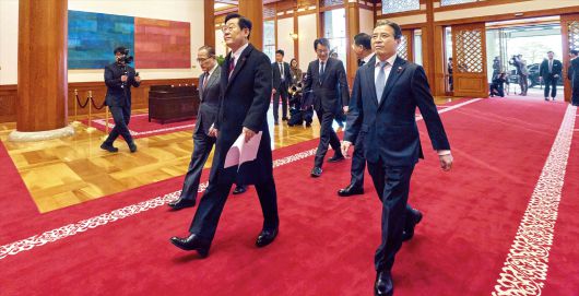 이재명 대통령이 29일 취임 7개월여 만에 처음 청와대 본관으로 출근하고 있다. 대통령의 ‘청와대 출근’은 문재인 전 대통령이 퇴임하는 날이었던 2022년 5월 9일로부터 1330일 만이다. 이 대통령 왼쪽은 위성락 국가안보실장, 오른쪽은 김용범 정책실장이다. 권혁기 의전비서관(뒷줄 왼쪽)과 황인권 경호처장(뒷줄 오른쪽)이 그 뒤를 따랐다.