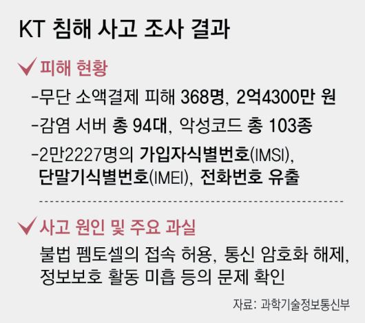 KT의 소형기지국(펨토셀) 관리 부실로 1300만 가입자의 정보가 유출될 뻔했던 것으로 나타났다. 이에 정부는 이용자에게 안전한 통신 서비스를 제공할 의무를 다하지 못한 책임을 물어 KT에 1300만 가입자가 다른 통신사로 이동하더라도 위약금을 받지 말아야 한다고 요구했다. KT의 과실이 명확하고, 서버 94대가 무려 103종의 악성코드에 감염되는 등 SK텔레콤 해킹 사고를 웃도는 ‘역대급’ 사고라고 판단해서다.