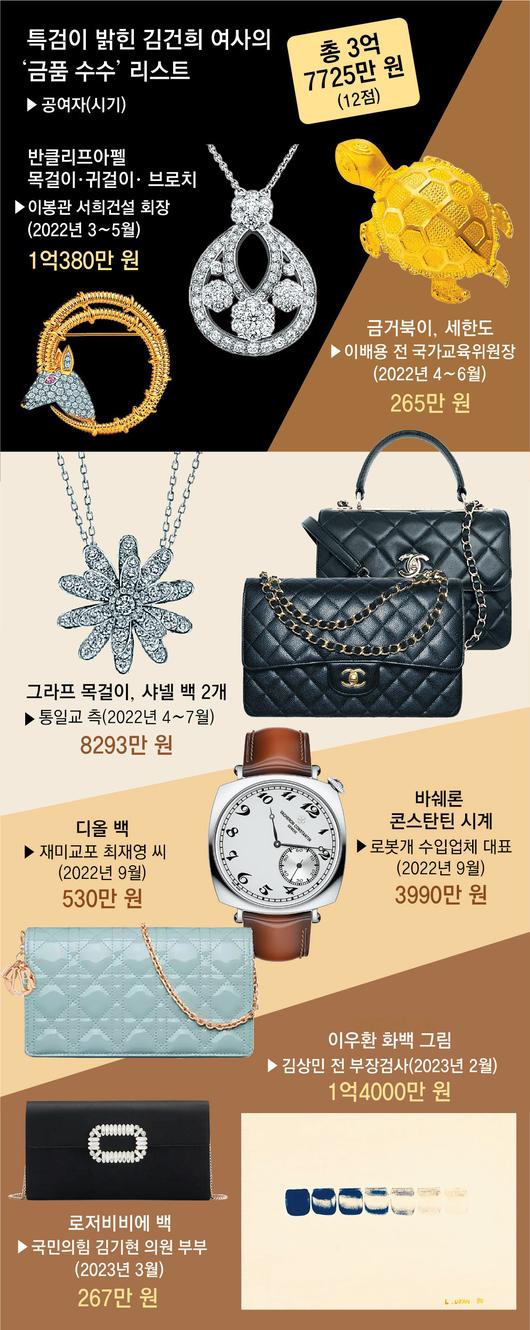 특검 수사 결과 김 여사의 로비 창구 기능은 윤 전 대통령 당선 직후부터 매우 조직적으로 시작된 것으로 드러났다. 2022년 3월 15일, 윤 전 대통령 당선 확정 불과 6일 만에 이봉관 서희건설 회장은 김 여사에게 반클리프아펠 목걸이를 전달했다. 이어 브로치를 건네면서 맏사위인 박성근 전 차장검사의 공직 임명을 청탁했고 박 전 차장검사는 석 달 만에 차관급인 국무총리 비서실장에 전격 발탁됐다. 이 외에도 김 여사는 이배용 전 국가교육위원장으로부터 금거북이 등을, 통일교 측으로부터는 무속인 건진법사 전성배 씨를 매개로 그라프 목걸이와 샤넬 백 2점을 받았다.