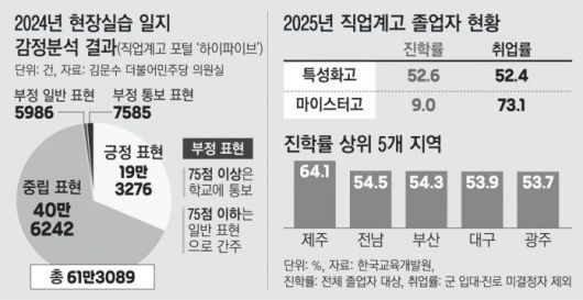 교육 당국은 학생들에게 매일 현장실습 일지를 작성하도록 하고 있다. 부당한 처우나 감정적 고충을 파악하기 위해서다. 직업계고 포털 ‘하이파이브’는 인공지능(AI)으로 실습일지를 모니터링한다. ‘힘들다’ ‘피곤하다’ 같은 부정적 표현이 일정 수준 이상 나오면 학교로 안내문을 보낸다. 김문수 더불어민주당 의원실이 확보한 현장실습 일지 감정분석 결과를 보면 지난해 작성된 일지 61만3089건 중 2.21%에 부정 표현이 담겼다.