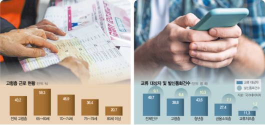 우리나라 65세 이상 고령층 인구 10명 중 4명은 은퇴 연령이 지났음에도 근로자나 자영업자로 경제활동을 이어가고 있는 것으로 나타났다. 이들 고령층은 한 달 평균 39명과 통화나 문자를 나누며 소통하고 하루 평균 16㎞를 이동하는 것으로 집계됐다. 반면 청년층은 경제·사회 활동이 가장 활발했지만 모바일 교류 대상자 수는 고령층과 큰 차이가 없어 사회적 고립 위험 역시 함께 안고 있는 것으로 분석됐다.