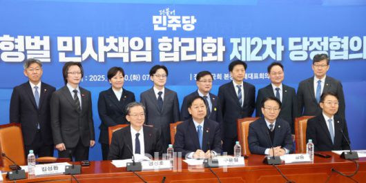 [이데일리 노진환 기자] 경제형벌 민사책임 합리화 제2차 당정협의가 30일 서울 여의도 국회에서 열렸다. 권칠승(앞줄 오른쪽 두번째) 민주당 경제형벌·민사책임 TF 단장과 구윤철(앞줄 오른쪽 세번째) 경제부총리 겸 기획재정부 장관 등 참석자들이 기념촬영을 하고 있다.