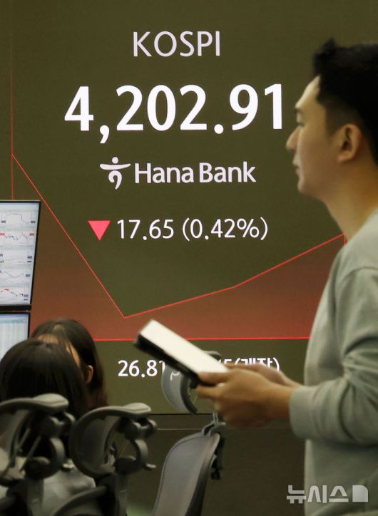 [서울=뉴시스] 홍효식 기자 = 코스피가 전 거래일(4220.56)보다 26.81포인트(0.64%) 내린 4193.75에 개장한 30일 오전 서울 중구 하나은행 딜링룸 전광판에 지수가 표시되고 있다.