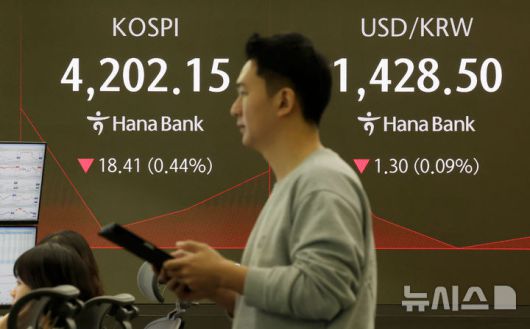 [서울=뉴시스] 홍효식 기자 = 코스피가 전 거래일(4220.56)보다 26.81포인트(0.64%) 내린 4193.75에 개장한 30일 오전 서울 중구 하나은행 딜링룸 전광판에 지수가 표시되고 있다.