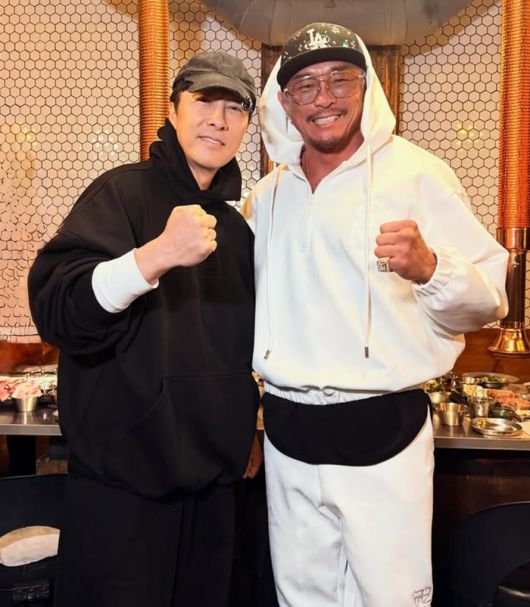 공개된 사진에는 추성훈과 견자단이 다정하게 포즈를 취하고 있는 모습이 담겼다. 두 사람은 주먹을 불끈 쥔 채 미소 짓고 있다.