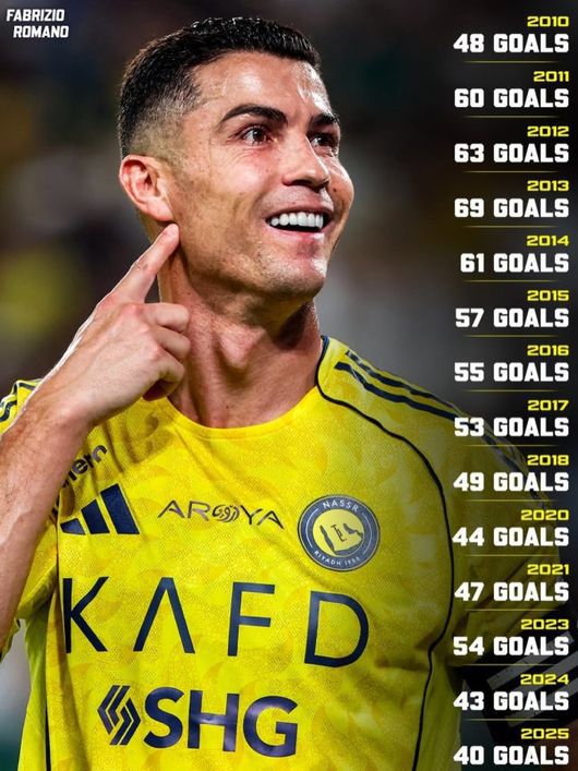 호날두는 지난 27일 알 오크두드 클럽과 맞대결에서도 멀티골을 터트리며 알 나스르의 3-0 승리를 견인했다. 두 번째 골은 그의 2025년 40번째 득점이기도 했다. 호날두는 올해에도 클럽과 대표팀을 합쳐 40번이나 골망을 흔들며 3년 연속 40골 고지를 밟았다.