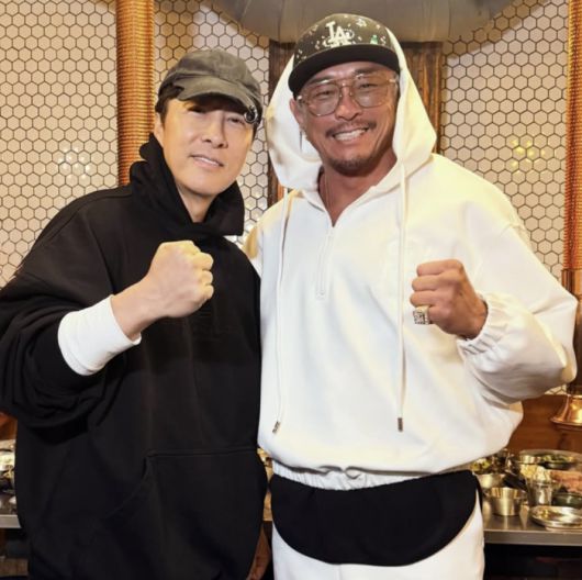 공개된 사진에는 추성훈과 견자단이 다정하게 포즈를 취하고 있는 모습이 담겼다. 격투기 선수와 액션배우로 각자의 분야에서 한 획을 그은 두 사람은 주먹을 불끈 쥐고 밝은 미소를 지었다.