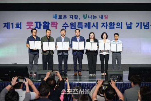 지난 7월 수원시 첫 자활의날 기념식에서 이재준 시장(가운데)을 비롯한 참석자들이 비전선언문을 들고 기념촬영을 하고 있다. 제공=수원시 |