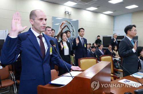 (서울=연합뉴스) 신현우 기자 = 30일 서울 여의도 국회에서 열린 쿠팡 침해사고 및 개인정보 유출, 불공정 거래, 노동환경 실태 파악과 재발 방지 대책 마련을 위한 청문회에서 해롤드 로저스 쿠팡 대표이사가 선서하고 있다. 2025.12.30
