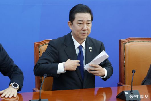 더불어민주당 김병기 원내대표가 30일 서울 여의도 국회에서 열린 원내대책회의에서 원내대표직 사퇴를 발표하고 있다. 박형기 기자 oneshot@donga.com |