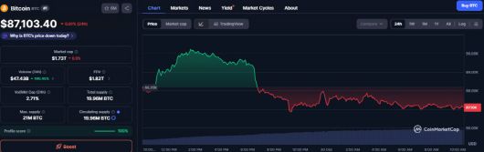 비트코인 등락 추이. 30일 오전 10시 30분 현재 8만7103.40달러. 출처 코인마켓캡 |