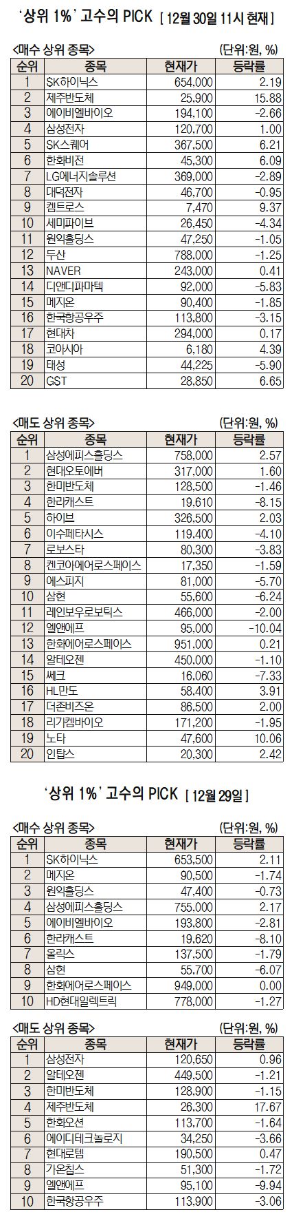 미래에셋증권에서 거래하는 고수익 투자자들이 을사년 마지막 거래일인 30일 오전 가장 많이 순매수한 종목은 SK하이닉스(000660), 제주반도체(080220), 에이비엘바이오(298380), 삼성전자(005930) 순으로 집계됐다.