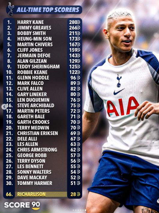 각 팀의 전설적인 선수들이 재소환된 가운데 토트넘의 통산 득점 순위에는 손흥민이 있었다. 토트넘 통산 득점 1위는 280골을 넣은 해리 케인이었고, 2위 지미 그리브스, 3위 바비 스미스였다.