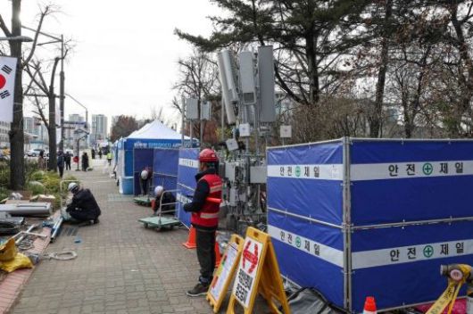 윤석열 대통령 탄핵소추안 재표결을 앞둔 12일 서울 여의도 국회 인근에서 통신사 작업자들이 원활한 통신 사용을 위해 기지국을 설치하고 있다. 강진형 기자 |