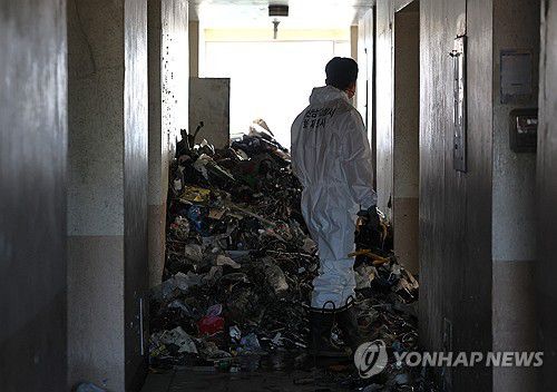 (울산=연합뉴스) 장지현 기자 = 30일 오전 국립과학수사연구원, 경찰, 소방 당국이 합동 감식 중인 울산 남구의 한 아파트 화재 현장에서 감식반 관계자가 복도에 쌓인 쓰레기 더미를 바라보고 있다. 이 아파트에서는 지난 28일 불이 나 저장강박 증세를 보이던 70대 월남전 참전용사가 숨졌다. 2025.12.30