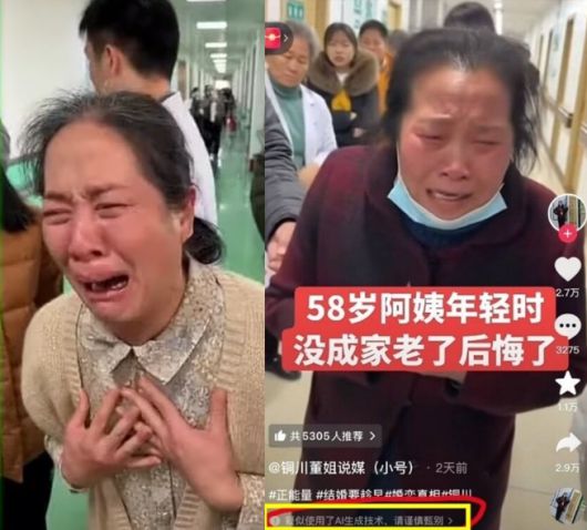 중국 부모들이 '결혼 안 한 걸 후회하는 여성'의 모습을 묘사한 인공지능(AI) 영상을 구매해 자녀들의 결혼을 압박하는 수단으로 사용하고 있다. 오른쪽 영상에는 '58세 여성이 젊었을 때 결혼하지 않은 것을 후회하고 있다'는 자막이 적혔다. /사진=SNS 갈무리