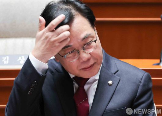[서울=뉴스핌] 윤창빈 기자 = 송언석 국민의힘 원내대표가 30일 서울 여의도 국회에서 열린 의원총회에서 머리를 쓸어 넘기고 있다. 2025.12.30 pangbin@newspim.com