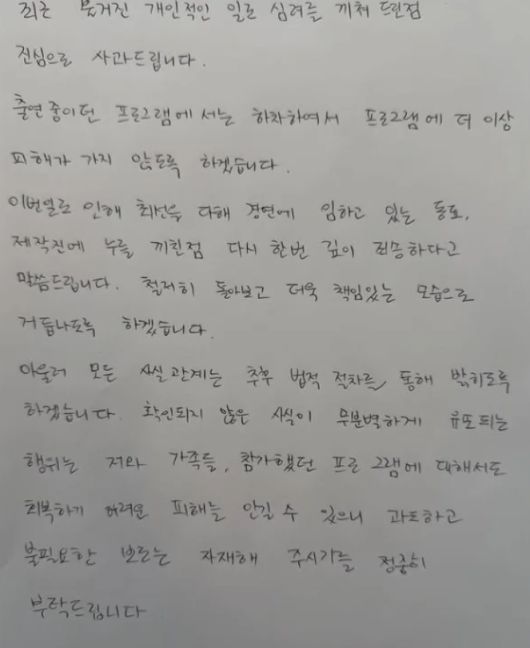 숙행은 "최근 불거진 개인적인 일로 심려를 끼쳐 드린 점 진심으로 사과드린다"며 프로그램 하차를 통해 더 이상 제작진 및 동료들에게 피해가 가지 않도록 하겠다고 전했다.