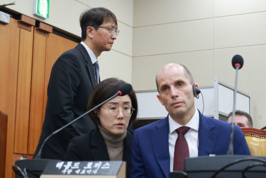 30일 국회에서 열린 쿠팡 침해사고 및 개인정보 유출, 불공정 거래, 노동환경 실태 파악과 재발 방지 대책 마련을 위한 청문회에서 박대준 전 쿠팡 대표이사가 의원 질의에 답한 뒤 자리로 돌아가고 있다. 오른쪽은 해롤드 로저스 쿠팡 대표이사. |