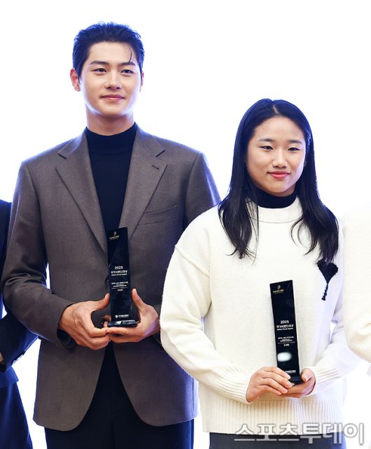 [스포츠투데이 팽현준 기자] 펜싱 오상욱, 배드민턴 안세영이 30일 서울 여의도 국회도서관 대강당에서 열린 '제10회 국가브랜드컨퍼런스'에서 수상하고 있다. 2025.12.30. [스포츠투데이 팽현준 기자 ent@stoo.com]