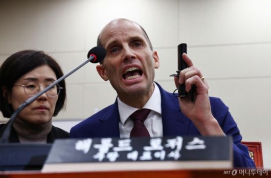 [서울=뉴시스] 김명년 기자 = 해롤드 로저스 쿠팡 대표이사가 30일 서울 여의도 국회에서 열린 쿠팡 침해사고 및 개인정보 유출, 불공정 거래, 노동환경 실태 파악과 재발방지 대책 마련을 위한 연석 청문회에서 최민희 과방위원장의 동시통역기 착용 요구에 대해 입장을 밝히고 있다. 2025.12.30. kmn@newsis.com /사진=김명년