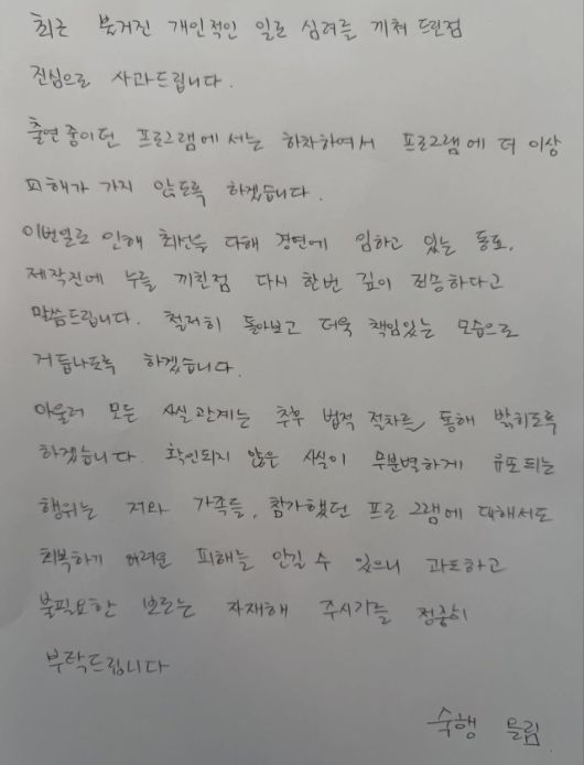 그는 “이번 일로 인해 최선을 다해 경연에 임하고 있는 동료, 제작진에 누를 끼친 점 다시 한번 깊이 죄송하다고 말씀드린다”며 “철저히 돌아보고 더욱 책임 있는 모습으로 거듭나도록 하겠다”고 했다.