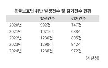 동물보호법 위반 검거 건수 역시 전반적인 확대 흐름을 보였다. 2020년 747건에서 2021년 688건으로 일시 감소했으나 2022년 805건으로 반등한 뒤 2023년 942건, 지난해 972건으로 꾸준히 늘었다.