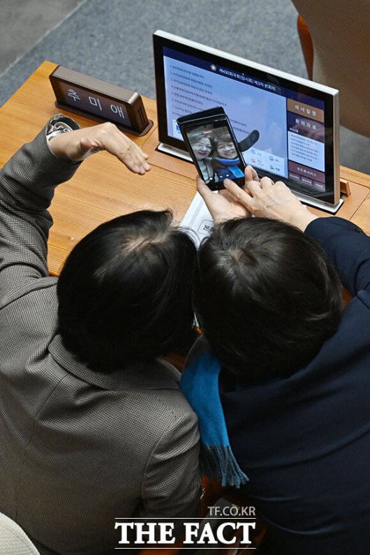 [더팩트ㅣ국회=남용희 기자] 추미애 더불어민주당 의원(왼쪽)과 서영교 의원이 30일 오후 서울 여의도 국회에서 열린 본회의 종료 후 기념촬영을 하고 있다.