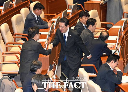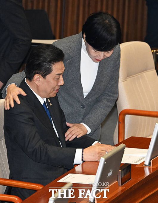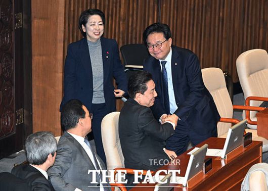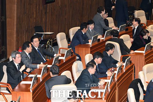 [더팩트ㅣ국회=배정한 기자] 김병기 더불어민주당 전 원내대표(왼쪽 두번째)가 30일 오후 서울 여의도 국회에서 열린 제430회 국회(임시회) 제3차 본회의에 참석하고 있다.