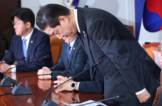 더불어민주당 김병기 원내대표가 30일 서울 여의도 국회에서 열린 원내대책회의에서 원내대표직 사퇴 의사를 밝히며 고개 숙여 사과하고 있다. |