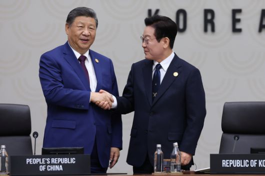 이재명 대통령(오른쪽)이 지난달 1일 경주화백컨벤션센터(HICO)에서 열린 2025 아시아태평양경제협력체(APEC) 정상회의 의장국 인계식에서 2026 APEC 의장국인 시진핑 중국 국가주석에게 의장직 지위를 넘기며 악수하고 있다. 연합뉴스 |