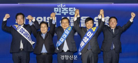 지난 23일 서울 여의도 더불어민주당사에서 열린 민주당 최고위원 보궐선거 1차 합동연설회에서 유동철(왼쭉부터)·문정복·이건태·이성윤·강득구 후보가 기념 촬영을 하고 있다. 국회사진기자단 |
