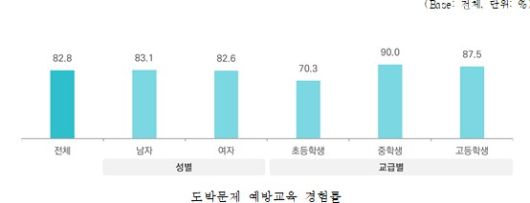 학교에서 도박의 위험성을 알리는 도박문제 예방교육을 한 번이라도 받아 본 청소년의 비율은 82.8%로 나타났다. 교급별로는 중학생이 90.0%로 가장 높았으며, 고등학생 87.5%, 초등학생 70.3% 순으로 조사되었다.