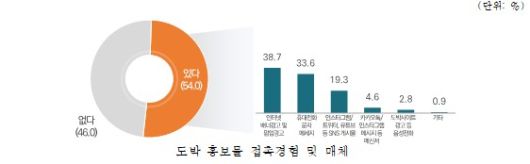 평생 경험한 도박 유형은 온라인 카지노 게임(35.8%), 오프라인 복권(31.7%), 온라인 미니게임(29.8%), 온라인 화투게임(17.2%), 온라인 스포츠 결과 돈걸기(16.0%), 온라인 복권(10.2%) 등의 순으로 나타났다. 특히 상위 6개 유형 중 오프라인 복권을 제외한 5개 항목이 모두 스마트폰이나 PC를 통한 온라인에 기반한 도박인 것으로 확인되었다.