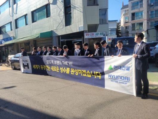 30일 열린 성수1지구 현장설명회를 찾은 현대건설 직원들이 현수막을 들고 조합원들에게 인사하고 있다. 독자 제공 |